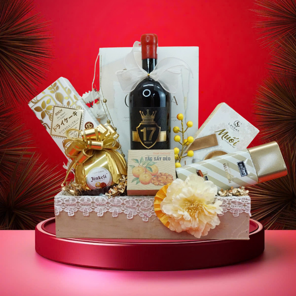 Chai vang Riserva Primitivo Vương Miện tượng trưng cho uy tín, vị thế và sự vững vàng, kết hợp cùng bánh kẹo và đồ uống cao cấp gửi gắm thông điệp phú quý, gắn kết và hạnh phúc bền lâu trong năm mới.